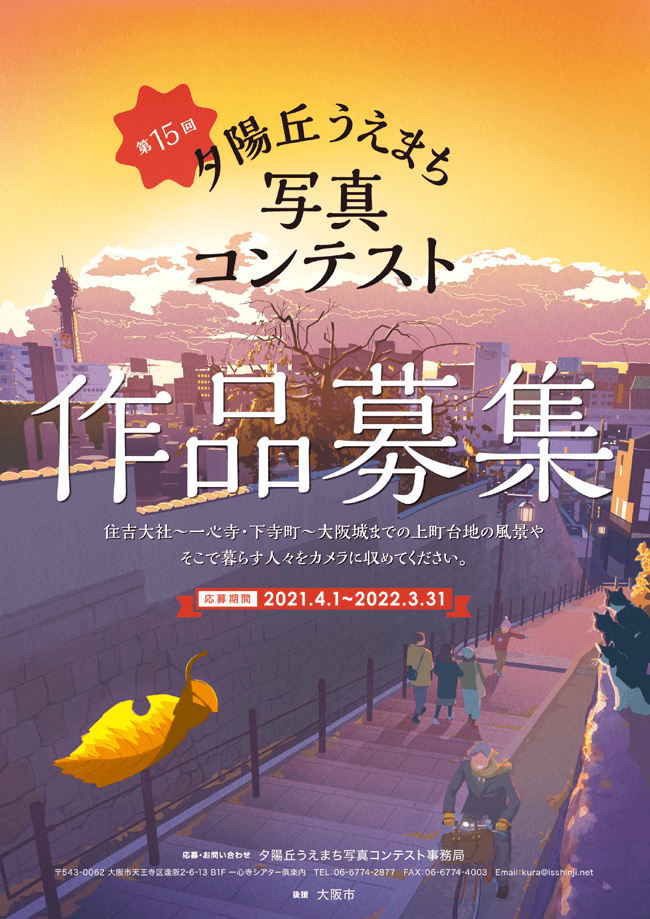 夕陽丘うえまち写真コンテスト事務局 〒543-0062 大阪市天王寺区逢阪2-6-13 B1F 一心寺シアター倶楽内 TEL:06-6774-2877  FAX:06-6774-4003 Email:kura@isshinji.net     詳細は夕陽丘うえまち写真コンテスト ホームページよりご確認いただけます。 http://isshinji.net/pic/ みなさまのご応募、お待ちしております!!