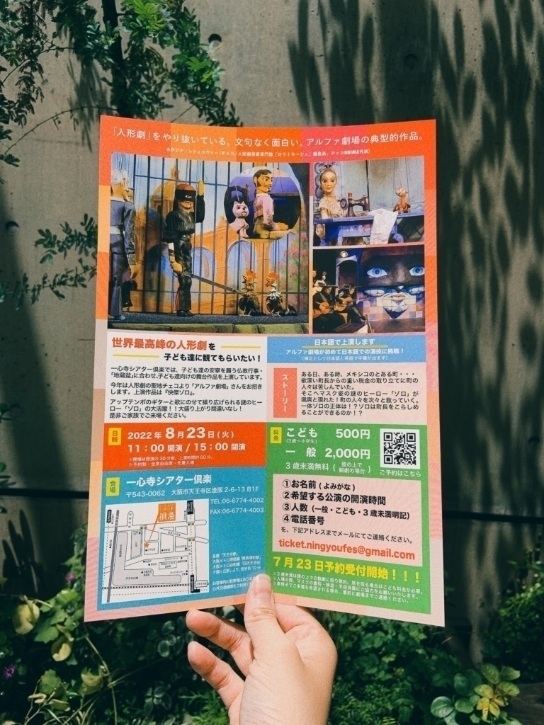 先日、『快傑ゾロ』お知らせページに詳細を追加しましたが、もうご覧いただけたでしょうか? 予約方法や注意事項、チラシのダウンロードもできるようになったので要チェックですよ👀🌟   さて、本日午前中に、『快傑ゾロ』のチラシが到着しました! できたてほやほや!!!やった〜!✨✨ 事務局長・髙口と「ええやんええやん」言って喜びました。笑   裏面もバッチリです!     一心寺シアター倶楽のチラシ棚では配布を開始しました。 今後、公共施設や店舗での設置、なにわ人形フェスでリーフレットを希望された皆さまにも送付を行います。 お手元に届くのは予約開始がもう少し近くなってからかもしれませんが、お待ちくださいませ🙇🌻   予約受付開始は7月23日(土)からとなります!