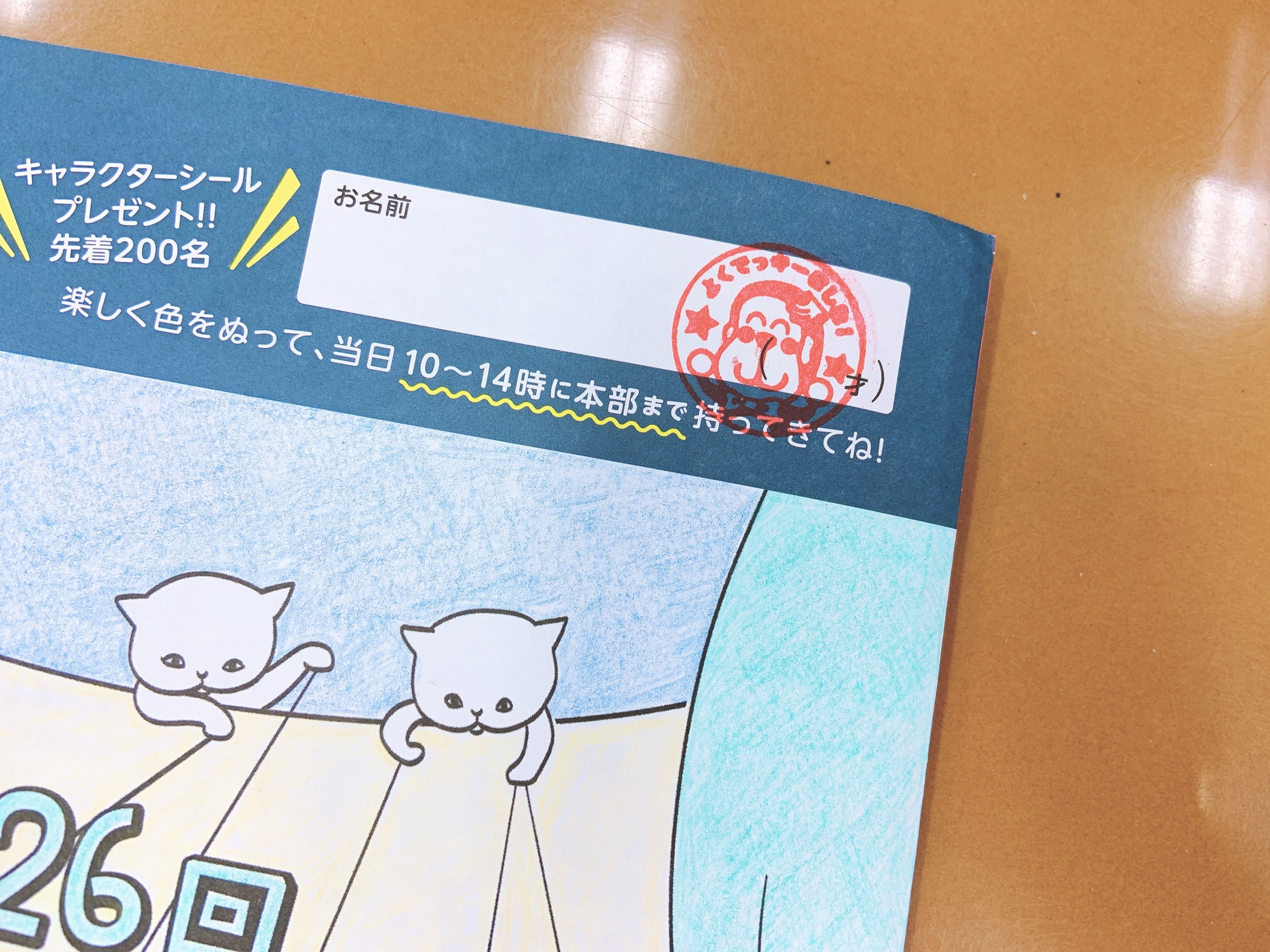 リーフレット裏表紙のぬり絵に楽しく色をぬって、当日本部まで持ってきてくれると、先着200名にキャラクターシールをプレゼント!というのをおこなっておりましたが・・・