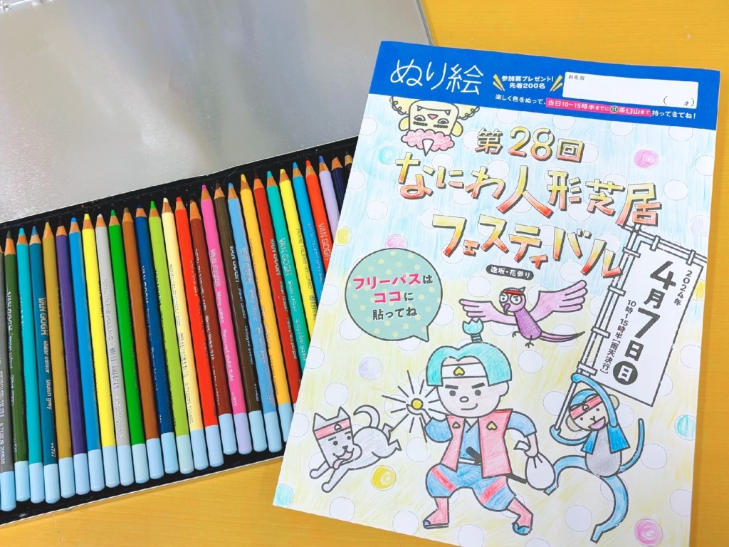 さて、なにわ人形芝居フェスティバル事務局では、おうちで楽しめるぬり絵付きリーフレットを配布中です。