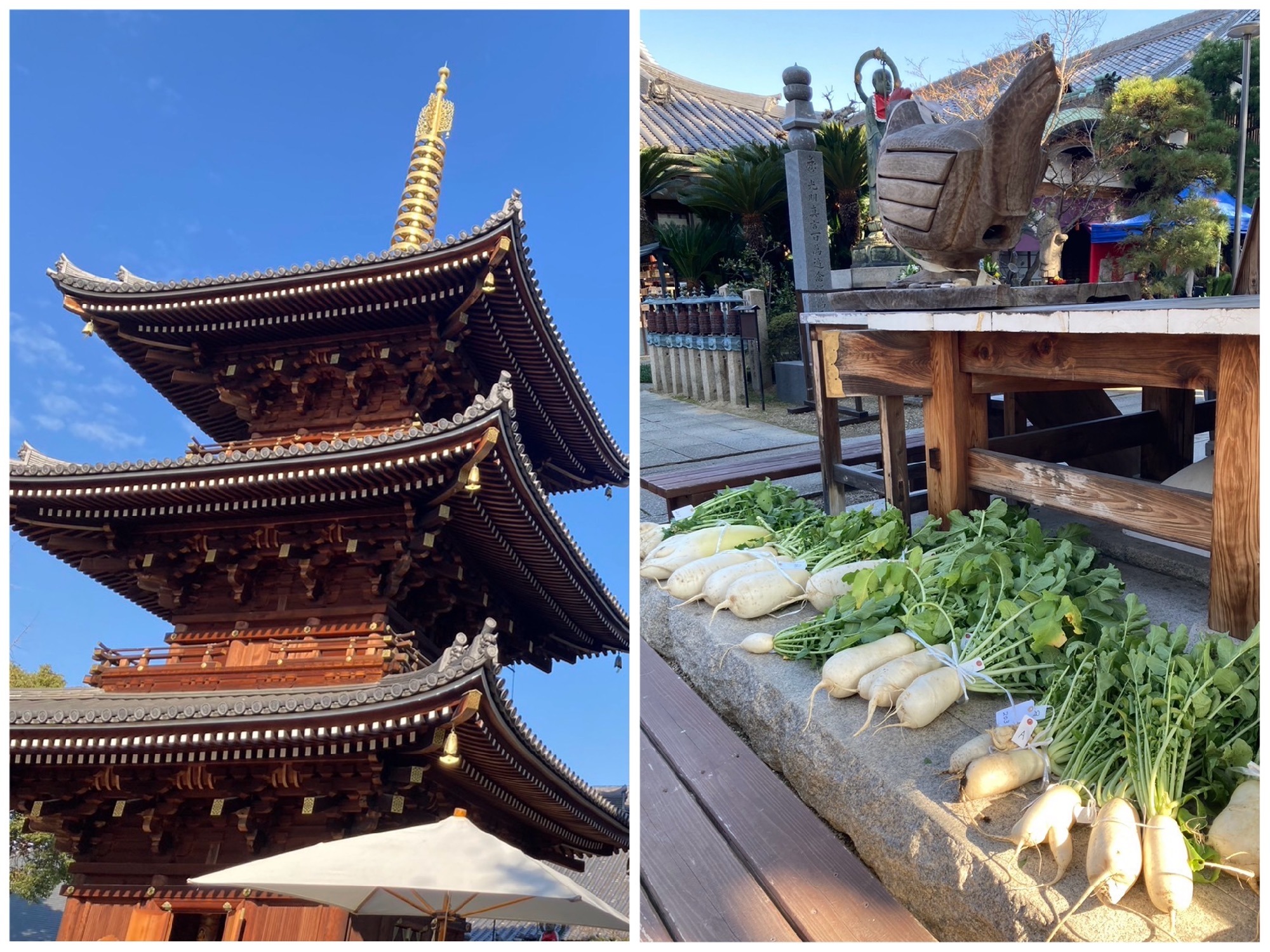 ⑥一心寺ロードで出店のなにわの伝統野菜応援団 おいしく豊食さんから 田辺大根のお花の写真が届きました! 白くて愛らしい菜の花ですね。   田辺大根は江戸時代にできた野菜で、肉質が緻密で歯切れの良い食感が特徴。 柔らかく甘みがあり、煮くずれしにくいため煮物に適し、独特の風味と辛さは漬物や辛みそばにも合います。 戦前は現在の東住吉区一帯で栽培され、大阪の家庭で普通に食べられていました。 中でも、田辺のお不動さんで親しまれている法楽寺の西門周辺の畑で栽培されていた品種は「横門大根」とよばれて珍重されていたようです。   事務局スタッフが昨年12月28日に、南田辺にある法楽寺の終い不動に訪れたそうで、 そのレポートももらったので掲載しちゃいます📃✍️   *****     昨年12月28日、南田辺にある法楽寺の終い不動に行ってきました。 お目当ては田辺大根の大根炊き! 無病息災を祈って境内でふるまわれます。   なにわ人形芝居フェスティバルに出店いただいている 「なにわの伝統野菜応援団 おいしく豊食」の豊下さんに教えていただいて、初めて行ってきました。   境内に着くと、ずらりと並んだ田辺大根に大勢の人が集まり、飛ぶように売れていきます。 私もなんとか無事ゲット。 ふるまいの大根炊きは、やわらかくてほっこり、とっても美味しかったです。   そのあとは、おいしく豊食さんのブースで試食させてもらったり、買い物したり、南田辺の町並みを散策したり。 良い一年の締めくくりになりました。     *****   田辺大根の大根炊き、めっちゃ美味しそうですね・・・!🥺✨ なにわの伝統野菜応援団 おいしく豊食さんは、なにわ人形フェス当日、金ごまと田辺大根葉の無塩ふりかけを販売されます! ほかにも、なにわの伝統野菜「鳥飼茄子」の漬物、鳥飼茄子肉まんとチマキの蒸し上げ販売や、生米糀あま酒試飲、伝統野菜の唐辛子、煮干などなどなど、食材調味料販売されますよ。 出店紹介ページには「珍しい田辺大根の種サヤの数量限定の試食も!(内容変更の場合あり)」と記載がありますが、連日の雨の影響で、試食ができるかどうか未定のようです。 自然の力をたっぷり受けて成長中なので、当日試食があるかどうかは来てみてのお楽しみ!   なにわ人形フェス、人形劇以外にも魅力たっぷりなんですよ、実は!☺️ お買い物もぜひして行ってくださいね。 4月7日(日)10:00〜15:30開催、雨天決行です! ご来場お待ちしております🙇🌸