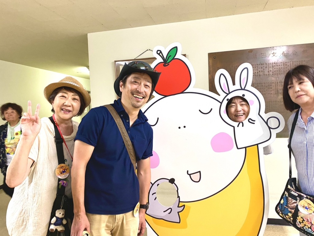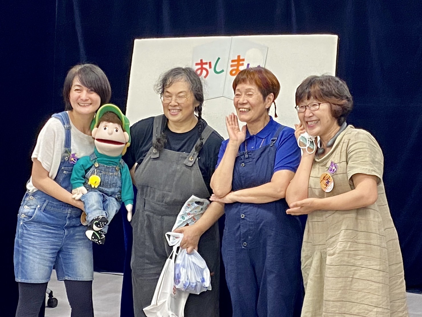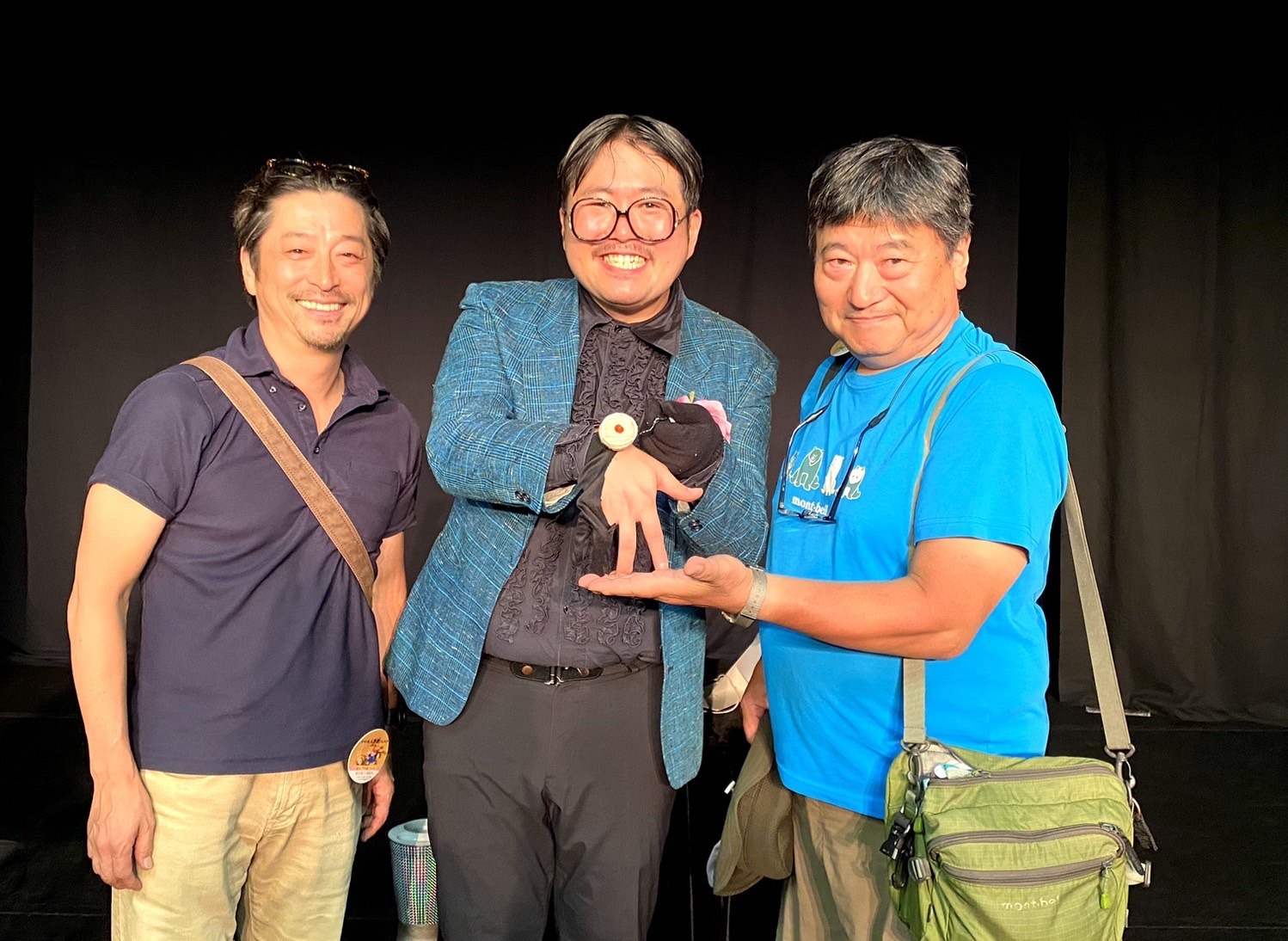 そして糸は観客全員を繋ぐ。 客席全部が笑いと、そして「連帯」という感覚に満ちていた。 素晴らしいパフォーマンスだった。 思わず「写真撮ってください!」 めちゃ腰も低い方でした。 大阪でフェスやってるとお伝えすると、 音響であり、通訳でもある方が、 「大阪にもいきたいです」と主人公の「頭」をプレゼントしていただいた。 カムサハムニダ! ・・・ という訳でこの演目をもってフェスタ2023は全て終了。 一応、オープニング公演~クロージング公演まで ずっと居た訳だ。 お疲れさまでした。 さて、少し「運営」みたいなことも書いておこうかと思う。 今回のいいだはコロナ明け第一回目。 正直「病み上がり」という印象だった。 全てが「7割5分」という感じ。 ま、それはしょうがないだろうし、 そんなことより「再開」したことを喜ぶべきだろう。 来年再ブーストして、100に戻った飯田にまた来たいなと思う。 が、それとは別に ●「高齢化でスタッフ減少」 ●「猛暑対策」 は深刻だろうな、と推察される。 だが、いいだ人形劇フェスタは人形劇界の宝だ。 皆で守っていかんといかん。 ではまた来年行きまっす!!