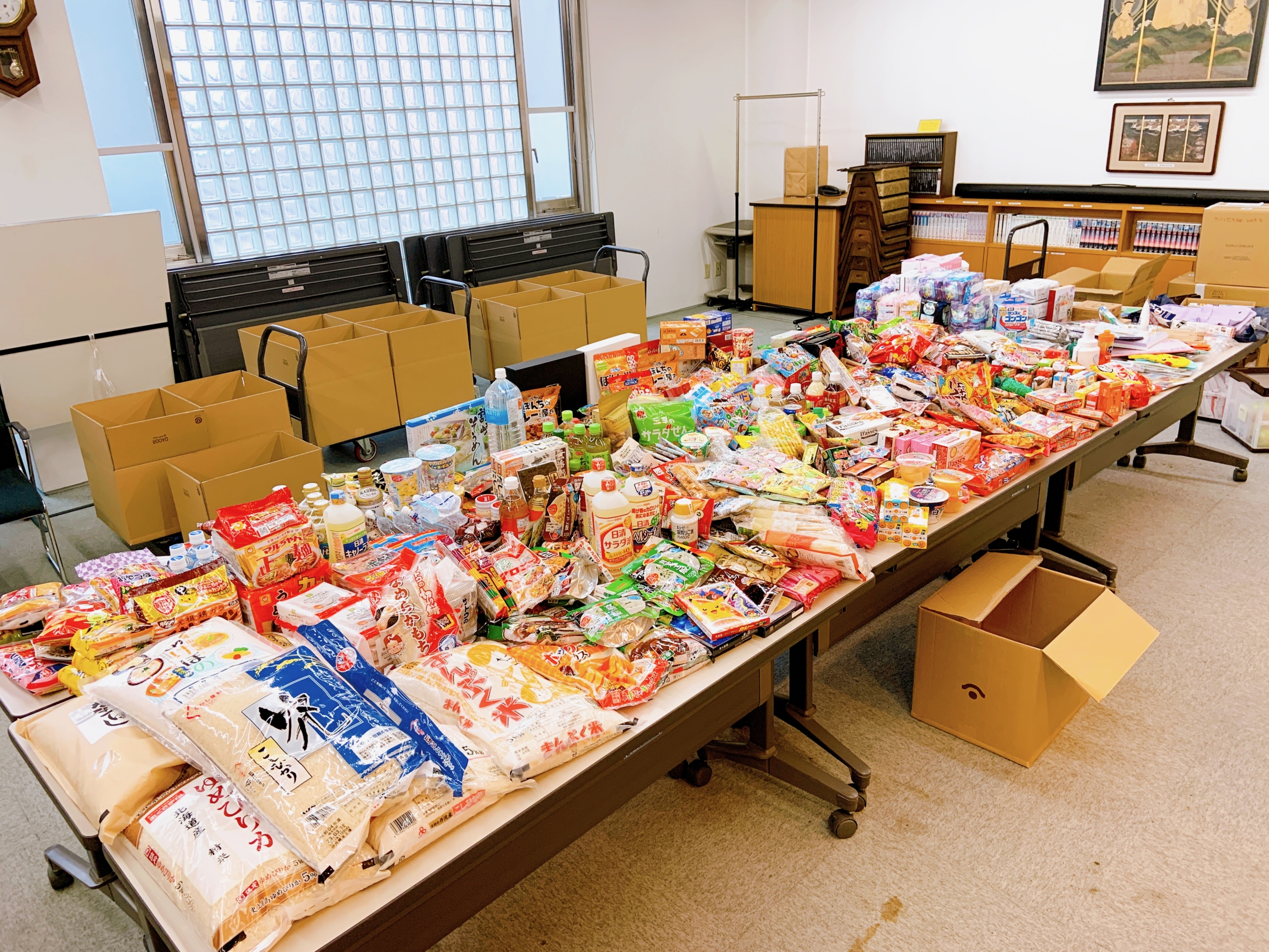 第27回なにわ人形芝居フェスティバルでは、おてらおやつクラブの活動として、 みなさまからの「おすそわけ」を募集いたしました。 たくさんの方にご協力いただきました!ありがとうございます! 4月15日、お預かりしたおすそわけの発送作業を行いましたので、ご報告させていただきます。   🌸🌸🌸   なにわ人形芝居フェスティバル事務局のある一心寺シアター倶楽では、 毎月15日に「おてらおやつクラブ」に登録されているこども食堂やNPO団体、ひとり親のご家庭に、 みなさまからお預かりした品物を送付しています。   フェス当日には、三千佛堂にておすそわけの受付と募金箱を設置し、 50Lの折り畳みコンテナ1つ分くらいの品物をお預かりいたしました。 ご協力くださったみなさま、誠にありがとうございます!   今月はそれに加えて、みなさまからの日々のおそなえものやおすそわけ、春のお彼岸のお下がりもあわせてお届けします。 賞味期限や品物の状態を確認するため、すべての品物を並べていくと・・・     今年も長机9台がいっぱいいっぱいになりました!!!!! しかも並びきらず、写真の外側にはまだまだ品物の詰まったコンテナや段ボールが置いてある状態・・・ うれしい悲鳴が上がりました。   今回はお米はパックご飯も合わせると75kgちかくありました そのほか、主食にもなる乾麺や即席麺、ホットケーキミックス、日々の食事に欠かせない調味料、 お子さまだけでも調理や食事がしやすいカップ麺やレトルトカレー、レンジで温める丼の素、 おやつにも、スナック菓子やチョコレート・ゼリー・果物の缶詰・季節菓子やキャラクター菓子、 これからの暑い季節に嬉しいジュースやお茶など飲料、鉛筆・ノート・ハサミ・折り紙などの文房具、 マスクやティッシュや生理用品や洗剤など日々の生活に欠かせない消耗品などなど・・・   団体さまへ向けて大きな段ボール10箱を送付することができました。 実は、今回どうしても時間と手が足りずに送付しきれませんでした。 賞味期限がとても長い食品類はまだコンテナ1つ分ほど残しておいて、来月以降のおすそわけで使用させていただきます。 賞味期限の長いものを選んでお持ちくださり、たいへん感謝いたしております。 まもなくGWが始まろうとしていて、給食のなくなる連休前なので、たいへん喜ばれると思います。みなさま、ご協力いただき本当にありがとうございます。 お届けできるものはすべて、大切にお届けさせていただきます。
