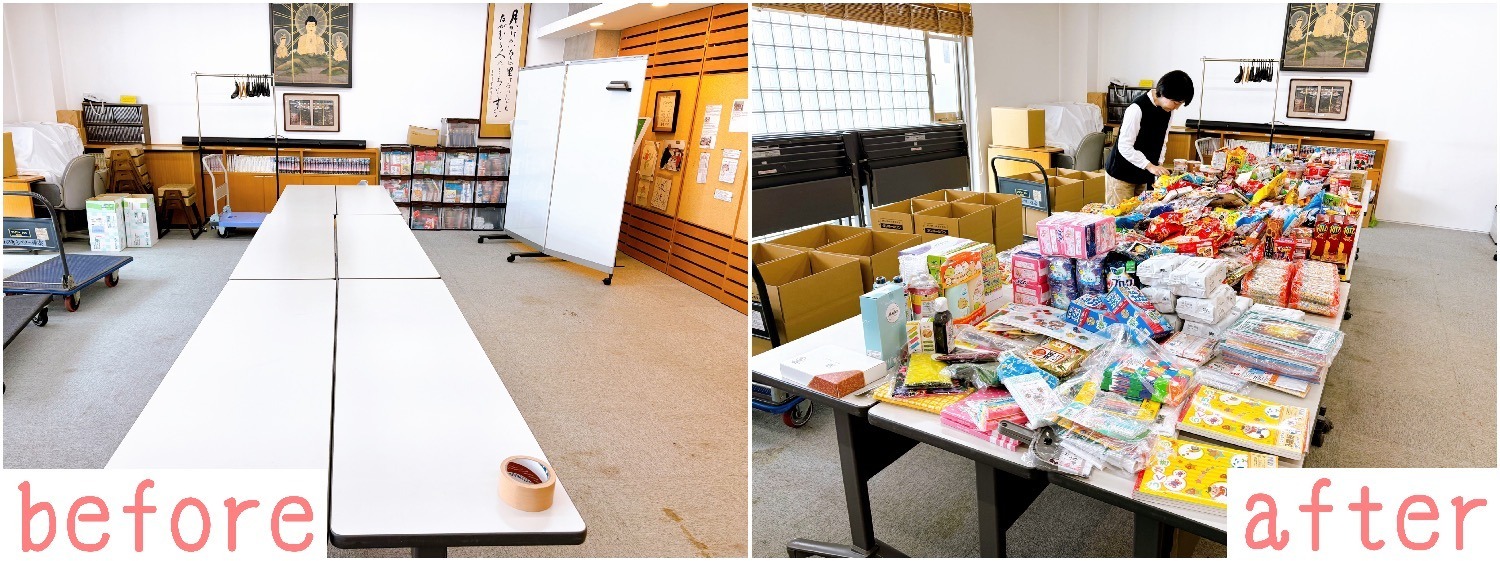 第28回なにわ人形芝居フェスティバルでは、おてらおやつクラブの活動として、 みなさまからの「おすそわけ」を募集いたしました。 たくさんの方にご協力いただきました!ありがとうございます! 4月15日、お預かりしたおすそわけの発送作業を行いましたので、ご報告させていただきます。   🌸🌸🌸   なにわ人形芝居フェスティバル事務局のある一心寺シアター倶楽では、 毎月15日に「おてらおやつクラブ」に登録されているこども食堂やNPO団体、ひとり親のご家庭に、 みなさまからお預かりした品物を送付しています。   フェス当日には、三千佛堂にておすそわけの受付と募金箱を設置し、 50Lの折り畳みコンテナ3つ分の品物をお預かりいたしました。 ご協力くださったみなさま、誠にありがとうございます!   今月はそれに加えて、みなさまからの日々のおそなえものやおすそわけ、春のお彼岸のお下がりもあわせてお届けします。 賞味期限や品物の状態を確認するため、すべての品物を並べていくと・・・     今年も長机9台がいっぱいいっぱいになりました!!!!! はじめは長机6台で乗るだろうと作業を開始するも並びきらず、9台に増やしたのに、 写真の外側には実はまだまだ品物の詰まったコンテナや段ボールが置いてある状態・・・ うれしい悲鳴が上がりました。   お米のほか、主食にもなる乾麺や即席麺、ホットケーキミックス、日々の食事に欠かせない調味料、 お子さまだけでも調理や食事がしやすいパックごはんやカップ麺やレトルトカレー、 おやつにも、スナック菓子やチョコレート・ゼリー・果物の缶詰・季節菓子やキャラクター菓子、 これからの暑い季節に嬉しいジュースやお茶など飲料、鉛筆・ノート・折り紙などの文房具、 シャンプーやティッシュや生理用品や洗剤など日々の生活に欠かせない消耗品、あると嬉しいエコバッグなどなど・・・   団体さまへ向けて大きな段ボール16箱を送付することができました。 賞味期限の長いものも多くあり、たいへん感謝いたしております。 まもなくGWが始まろうとしていて、給食のなくなる連休前なので、たいへん喜ばれると思います。 みなさま、ご協力いただき本当にありがとうございます。 お届けできるものはすべて、大切にお届けさせていただきます。     ご無理のない範囲で、今後ともご協力を頂けましたら幸いです。 よろしくお願いいたします。